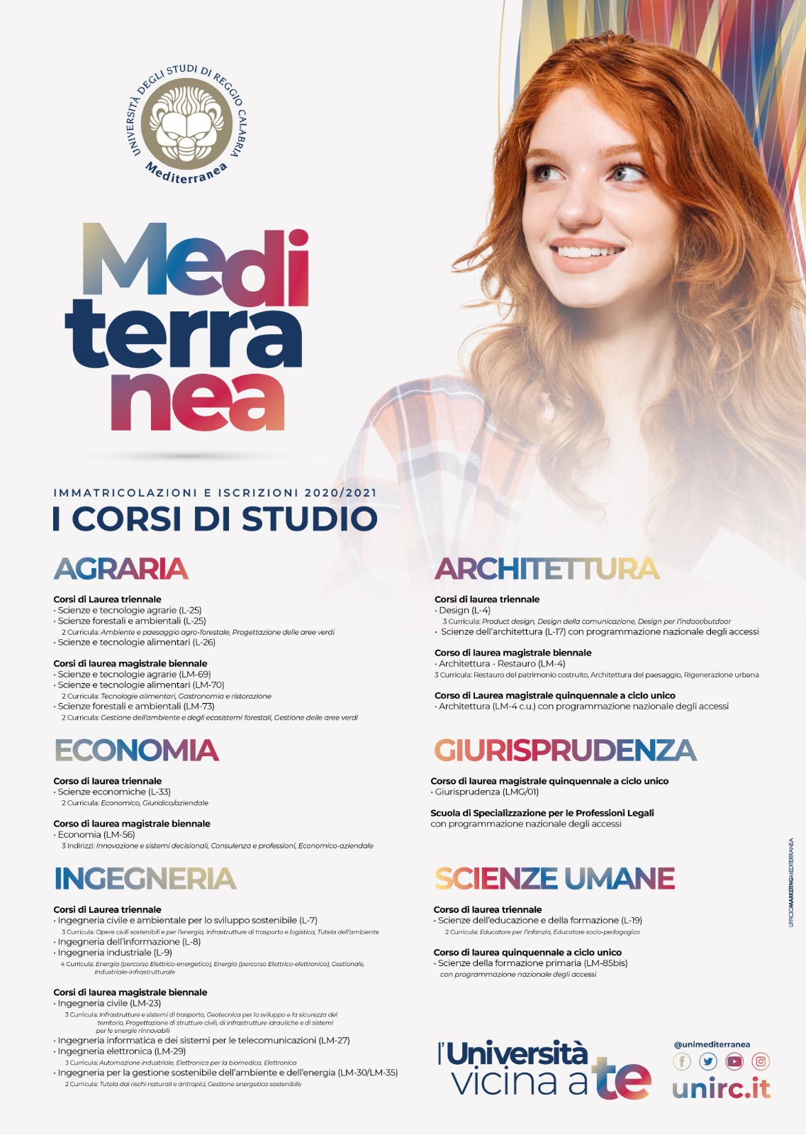Il Corso di Studi è attivo presso la Mediterranea che dispone di 157 posti, di cui 20 riservati a studenti extra UE e non residenti in Italia.
